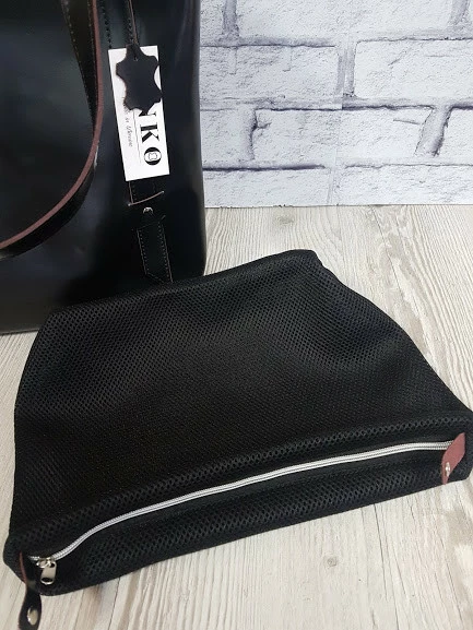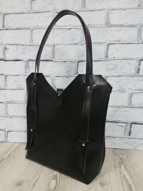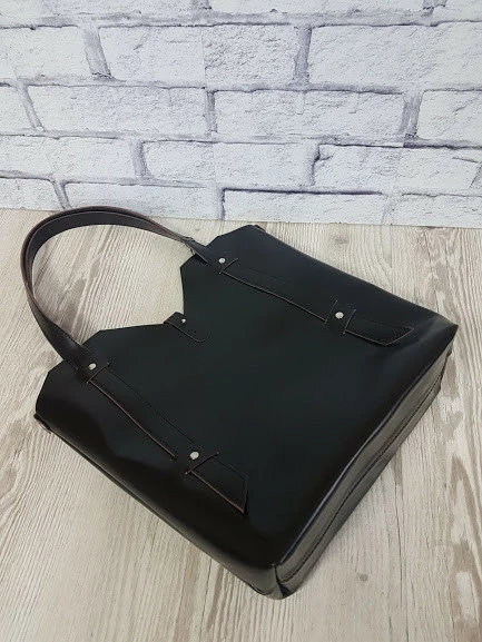 Вместительная сумка из натуральной кожи, внутри специальное отделение - футляр, которое крепится с помощью кожаного ремешка, отделение-футляр на кнопке. Высота ручек 25см.