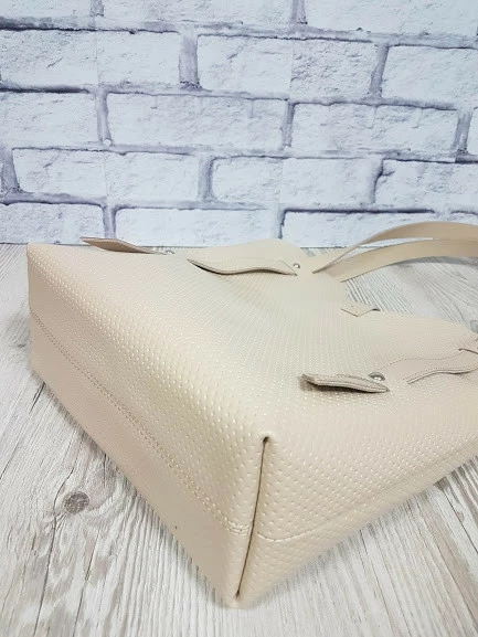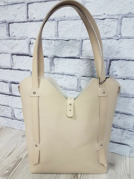 Вместительная сумка из натуральной кожи, внутри специальное отделение - футляр, которое крепится с помощью кожаного ремешка, отделение-футляр на кнопке. Высота ручек 25см.