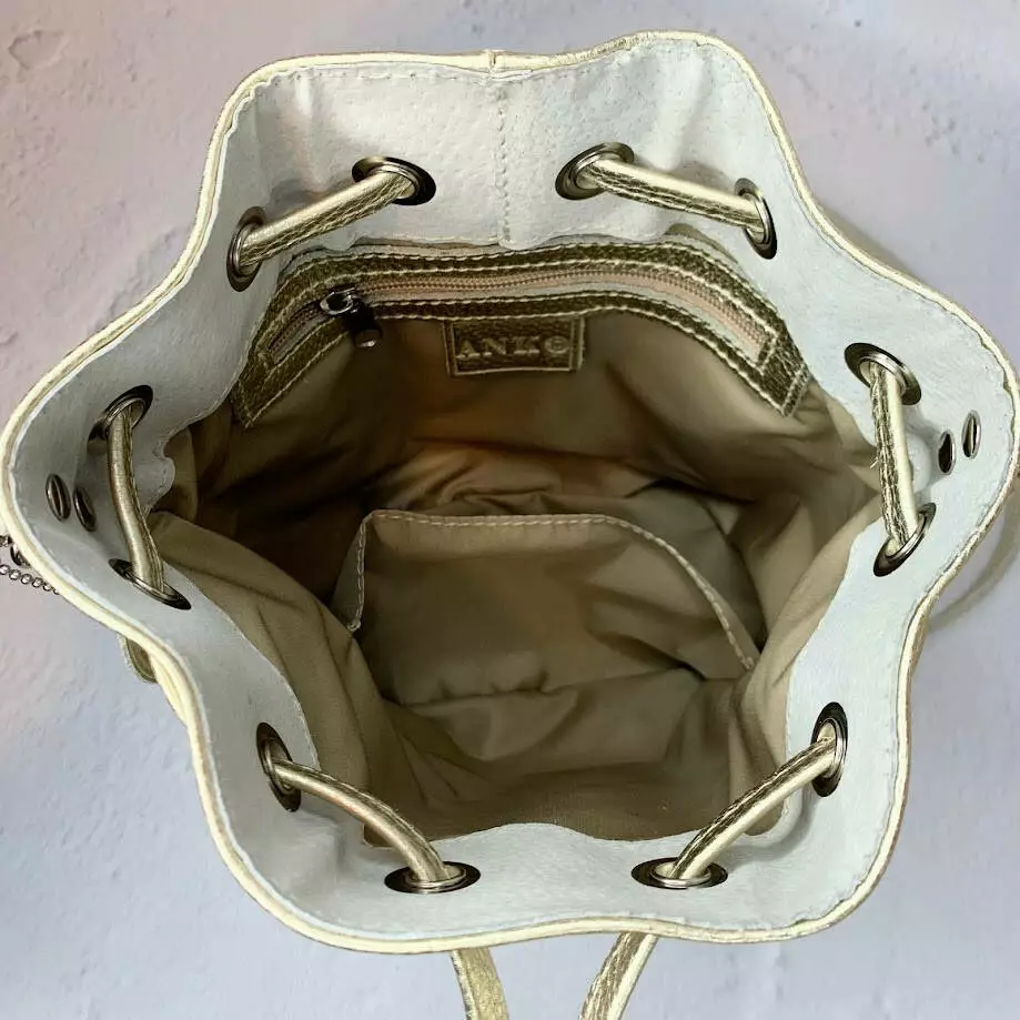 есть открытый карман. Закрывается на кожаную затяжку.