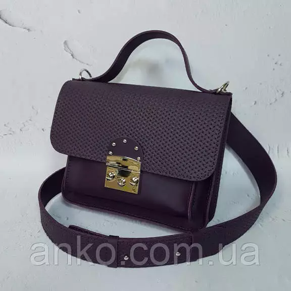 Сумочка закрывается на замок-защелку, имеет два отделения и потайной внутренний карман. Имеется короткая ручка и широкий плечевой ремень на карабинах с регулировкой длины.