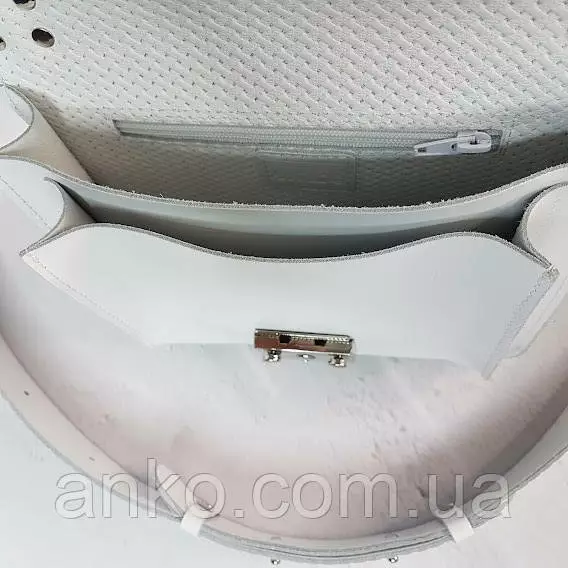 Сумочка закрывается на замок-защелку, имеет два отделения и потайной внутренний карман. Имеется короткая ручка и широкий плечевой ремень на карабинах с регулировкой длины.