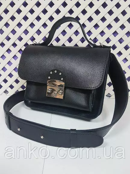 Сумочка закрывается на замок-защелку, имеет два отделения и потайной внутренний карман. Имеется короткая ручка и широкий плечевой ремень на карабинах с регулировкой длины.