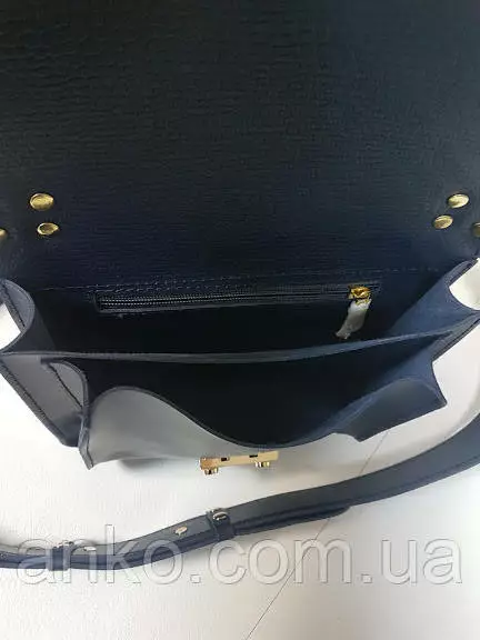 Сумочка закрывается на замок-защелку, имеет два отделения и потайной внутренний карман. Имеется короткая ручка и широкий плечевой ремень на карабинах с регулировкой длины.