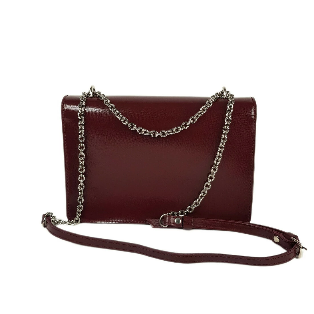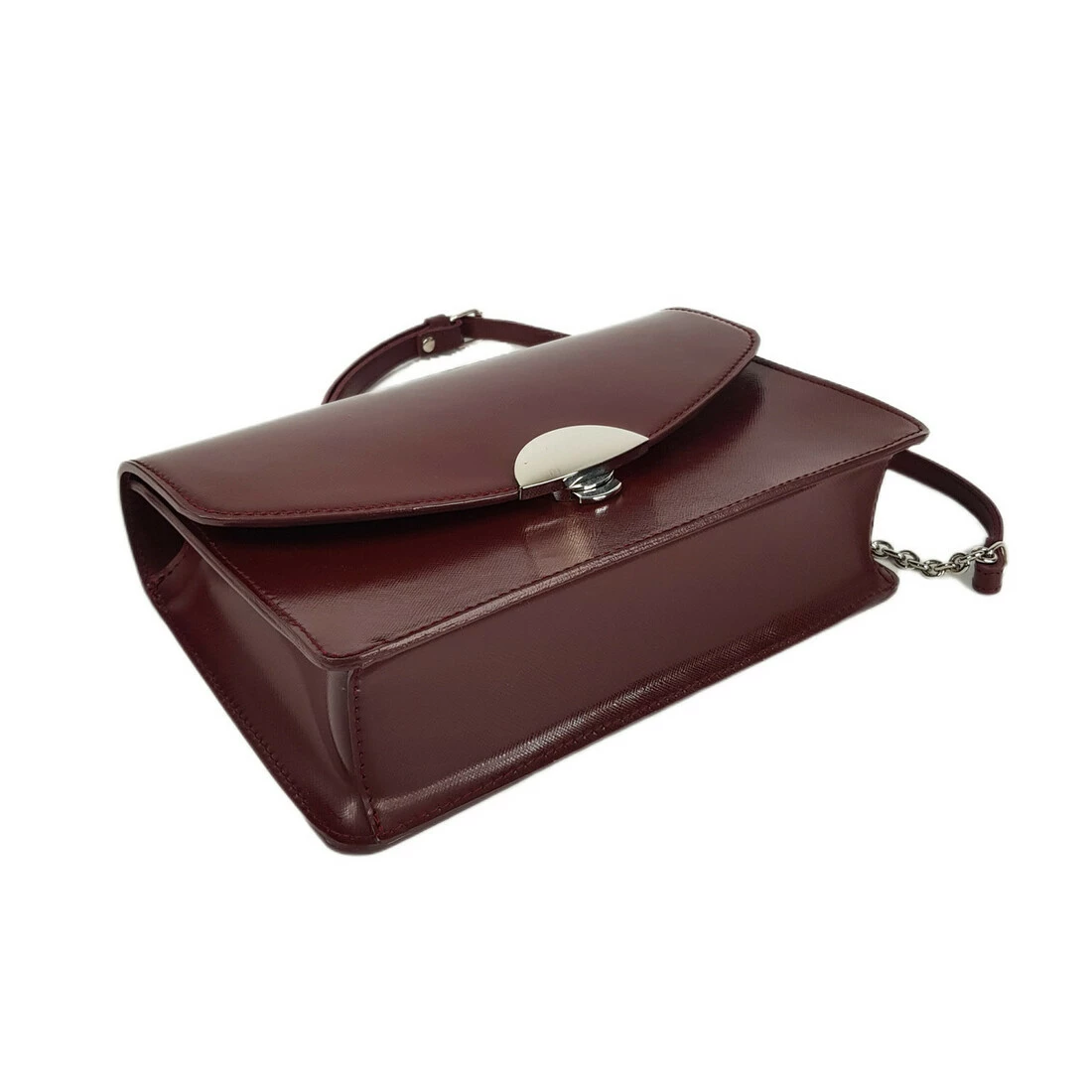 Сумка закрывается на замок-защелку, имеет одно основное отделение, внутри карман на молнии и два открытых кармана. Плечевой ремень регулируется с помощью пряжки и за счет вставки из цепочки, возможно в два раза уменьшить длину ремня.