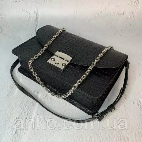 Сумка закрывается на замок-защелку, имеет одно основное отделение, внутри карман на молнии и два открытых кармана. Плечевой ремень регулируется с помощью пряжки и за счет вставки из цепочки, возможно в два раза уменьшить длину ремня.