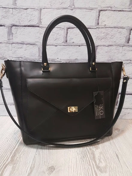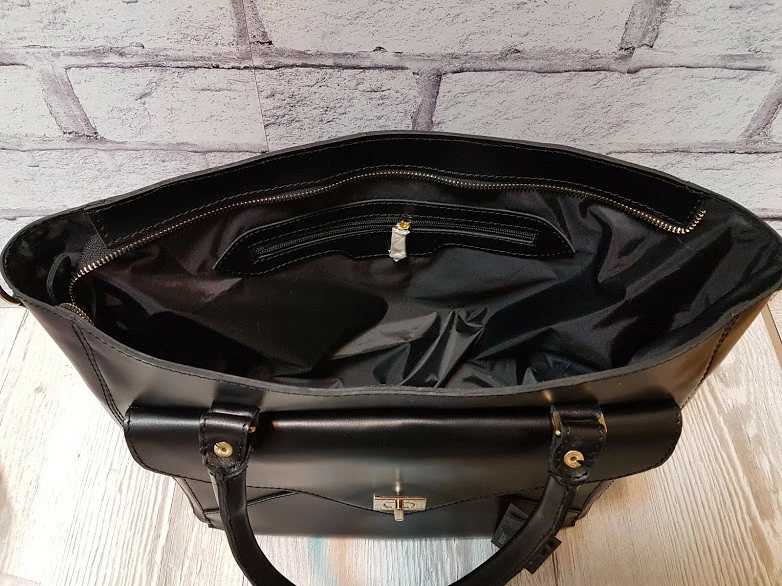 Сумка на подкладке, внутри находятся два открытых кармана (по надобности можем сделать дополнительный карман на молнии). Присутствуют плечевой ремень и короткие ручки, которые по надобности мы можем удлинить или укоротить. Плечевой ремень двойной, не регулируется. Снаружи находится конверт-карман на поворотном замке.