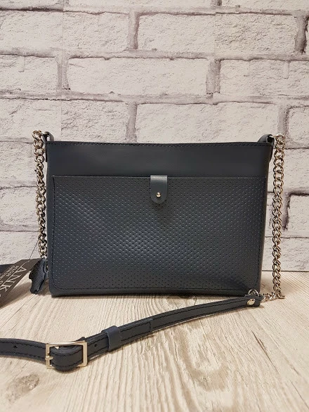 Сумка женская "Деми" натуральная кожа, серо-синяя с плетенкой