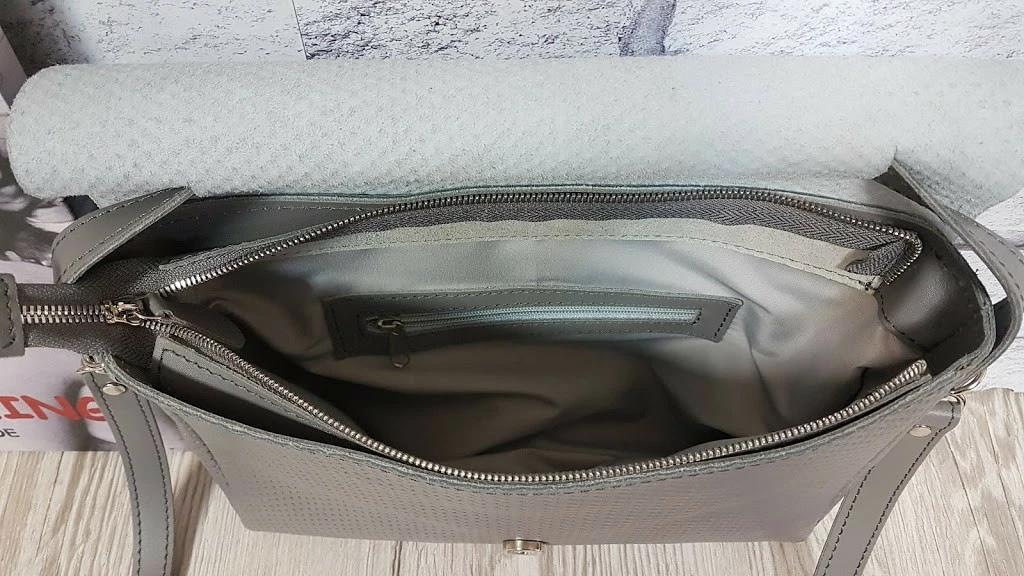 Внутри сумки имеется карман на молнии. Плечевой ремень двойной,
