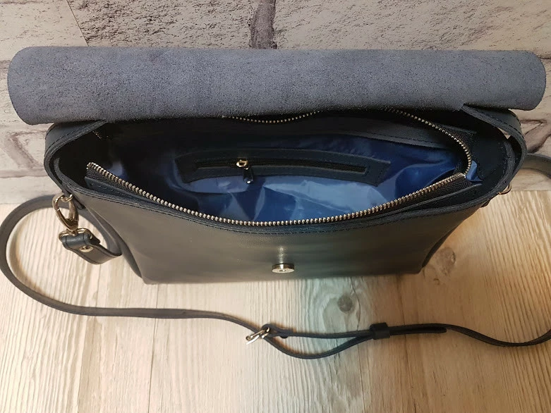 Внутри сумки имеется карман на молнии. Плечевой ремень двойной,