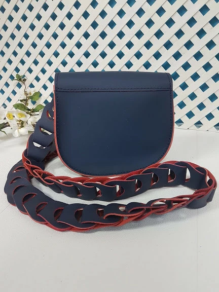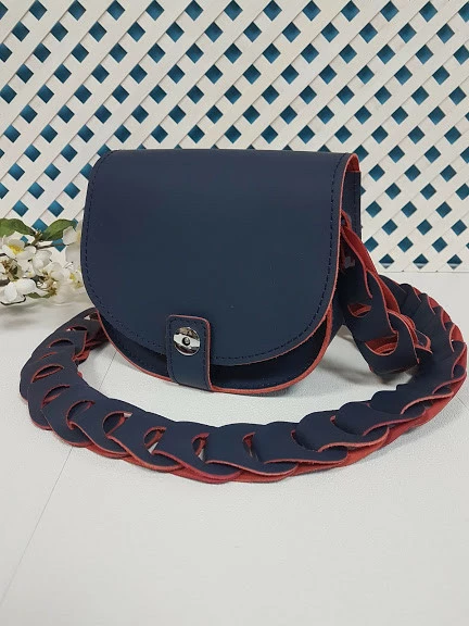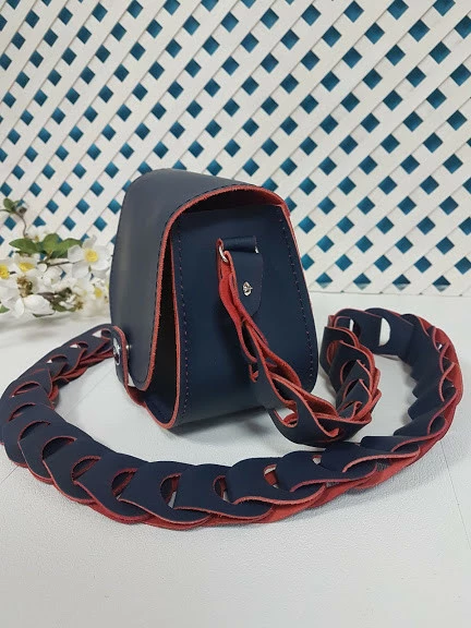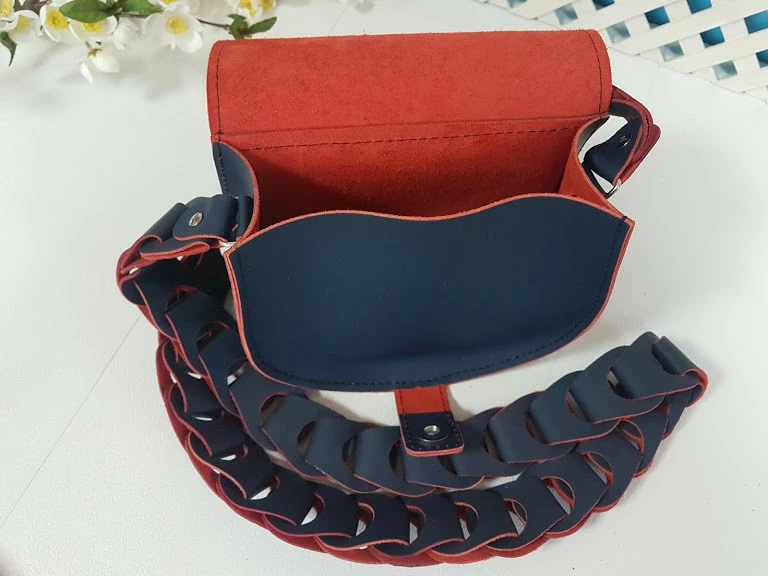 Сумка женская "Кенди" ремень-плетение натуральная кожа, синяя с красной изнанкой