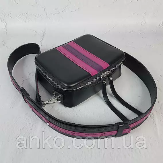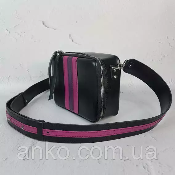 Сумка женская "КВАДРО" натуральная кожа, черная/фуксия с широким ремнем