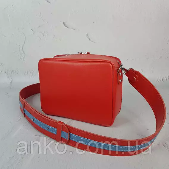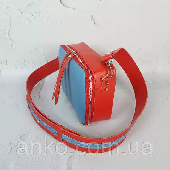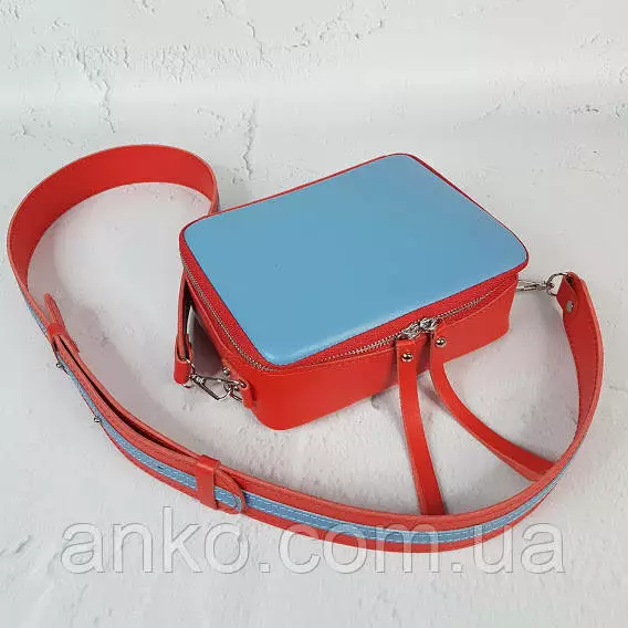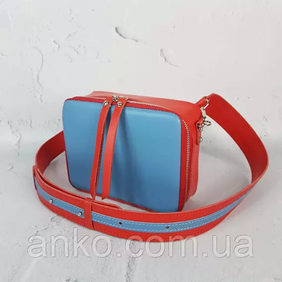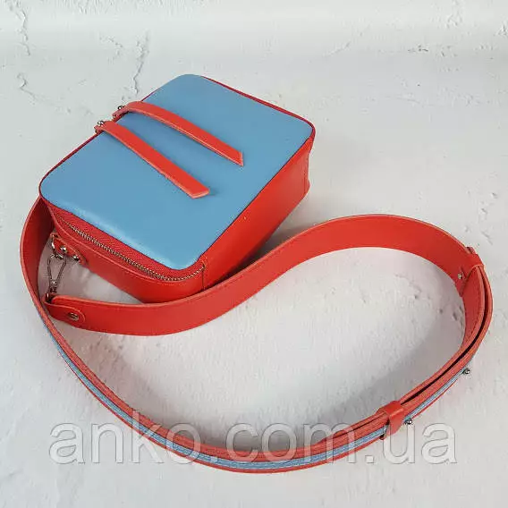 Сумка женская "КВАДРО" натуральная кожа, паприка/голубая с широким ремнем