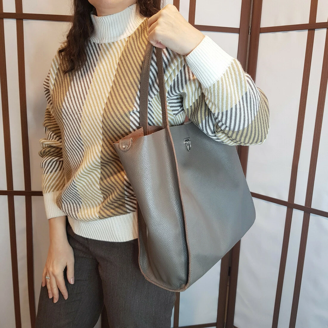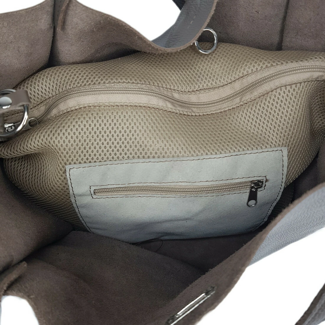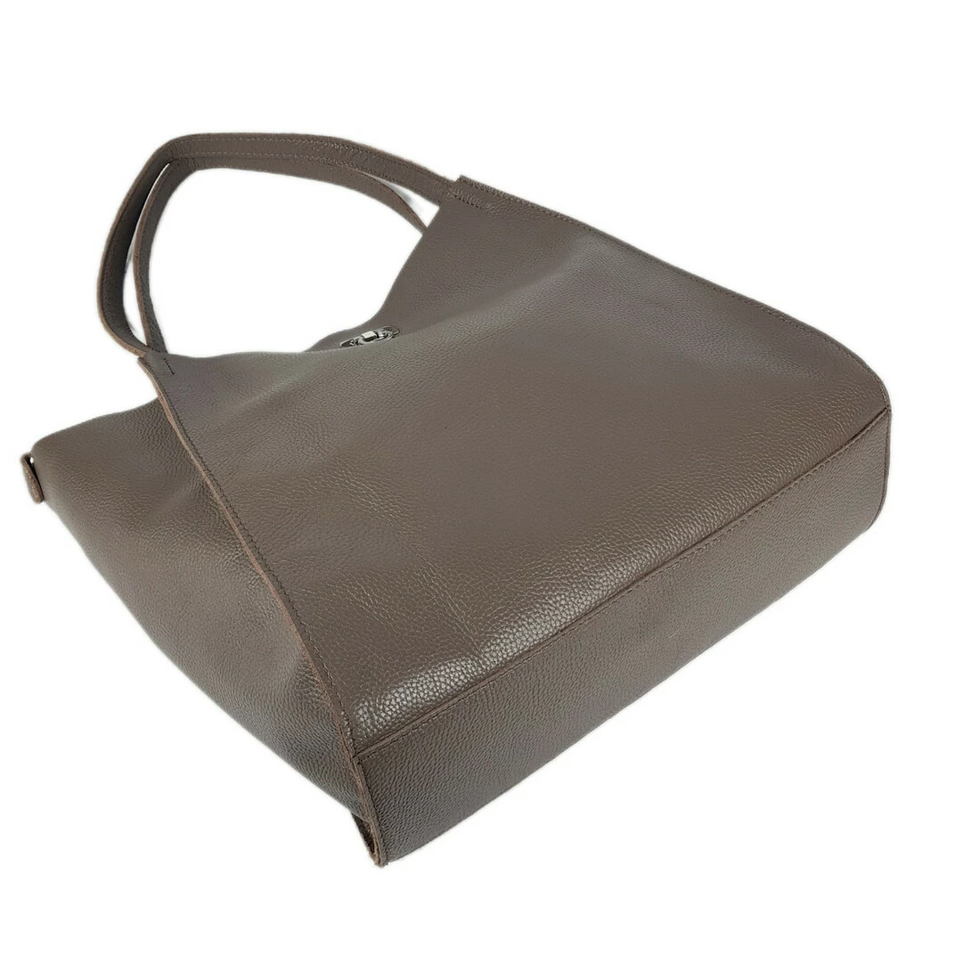 Вместительная сумка-шопер изготовлена из натуральной кожи. Внутри основного отделения есть тканевый кофр на молнии, который крепится к сумке на кнопку с помощью кожаного ремешка.