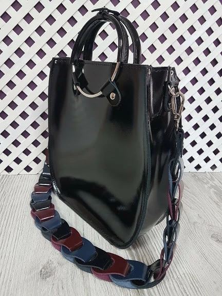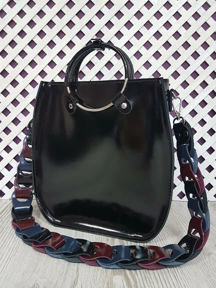 Сумка женская "Мальва" натуральная кожа, черный глянец с цветным ремнем