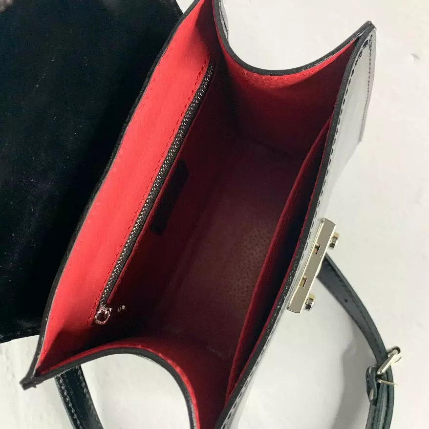 Закрывается на замок-защелку, имеет одно основное отделения и два внутренних кармана, один на молнии и один открытый. Имеется короткая ручка и плечевой ремень на карабинах с регулировкой длины.