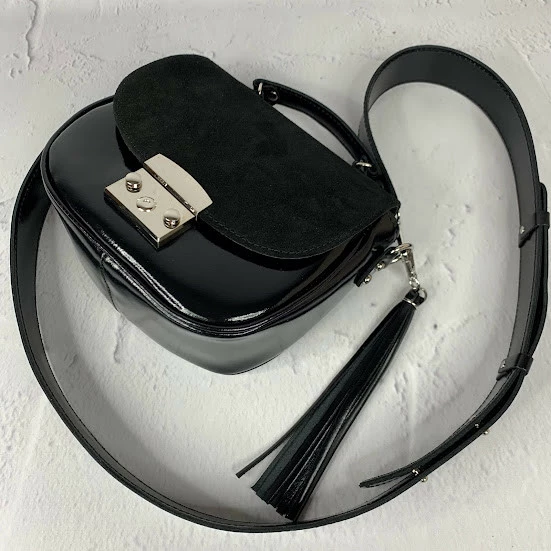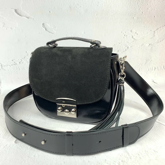 Сумка женская "Римини" натуральная кожа, черная глянцевая с замшевым клапаном